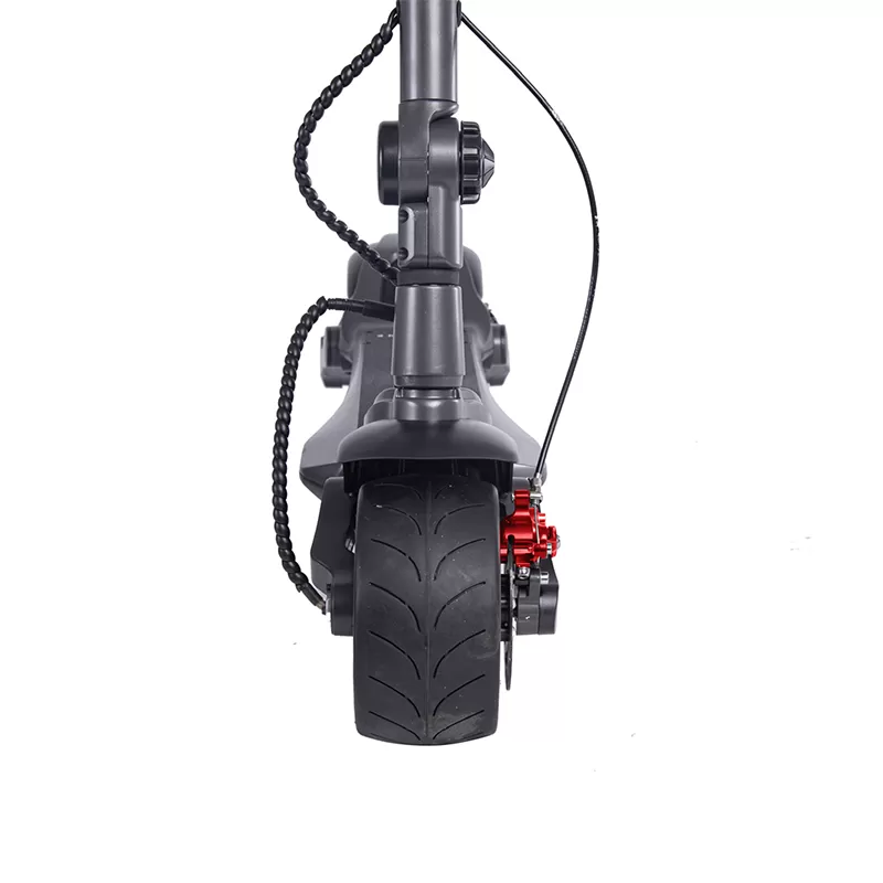 ✓ Bezpečnost O bezpečnost jezdce je postaráno mohutnými 120 mm širokými kotouči nově na obou kolech, které v součinnosti se širokými plášti dovolují extrémně krátkou brzdnou dráhu i pro jezdce kolem maximální doporučené hmotnosti 120 kg. Nechybí ani přední a zadní výkonné LED světla, to zadní funguje zároveň jako brzdové světlo.
